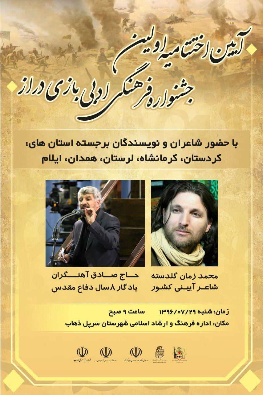 به گزارش خبرگزاری صدا و سیما مرکز کرمانشاه، این مراسم ساعت ۹ صبح فردا (شنبه ۲۹ مهر) با حضور شاعران و نویسندگان برجسته آیین اختتامیه اولین جشنواره فرهنگی ادبی بازی دراز در سرپل ذهاباستان‌های کردستان، کرمانشاه، لرستان، همدان و ایلام در محل اداره فرهنگ و ارشاد اسلامی شهرستان سرپل ذهاب برگزار می‌شود.