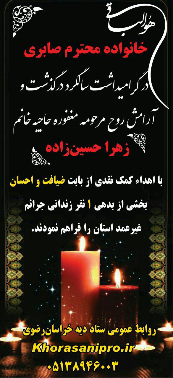 خانواده مرحومه حسینزاده، بخشی از هزینه مراسم سالگرد آن مرحومه را به نمایندگی این ستاد در مشهد اهدا کردند و با این اقدام باعث آزادی یک زندانی بدهکار مالی از زندان شدند.
