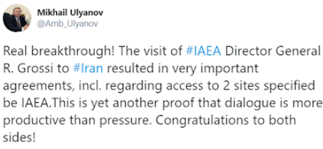 به گزارش سرویس بین الملل خبرگزاری صدا و سیما، میخاییل اولیانوف نماینده دائم روسیه در سازمانهای بین المللی وین نوشت: دستاوردی واقعی! دیدار رافائل گروسی دبیرکل آژانس بین المللی انرژی اتمی از ایران به توافقات بسیار مهمی انجامید، از جمله در خصوص دسترسی به دو سایت مد نظر آژانس. این نشانه دیگری است از اینکه گفتگو از فشار موثرتر است. تبریک به هر دو طرف!