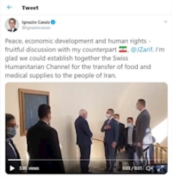 به گزارش سرویس بین الملل خبرگزاری صدا و سیما، سفارت سوئیس در ایران با انتشار پیامی در صفحه کاربری خود در توئیتر به نقل از وزیر امور خارجه سوئیس که به تهران سفر کرده است، نوشت: «صلح، توسعه اقتصادی و حقوق بشر– گفتگو‌های مفید با همتای ایرانی‌ام جواد ظریف. خرسندم که توانستیم همراه هم کانال انسان‌دوستانه سوئیس را به منظور انتقال ذخایر غذا و دارو برای مردم ایران راه‌اندازی کنیم.»