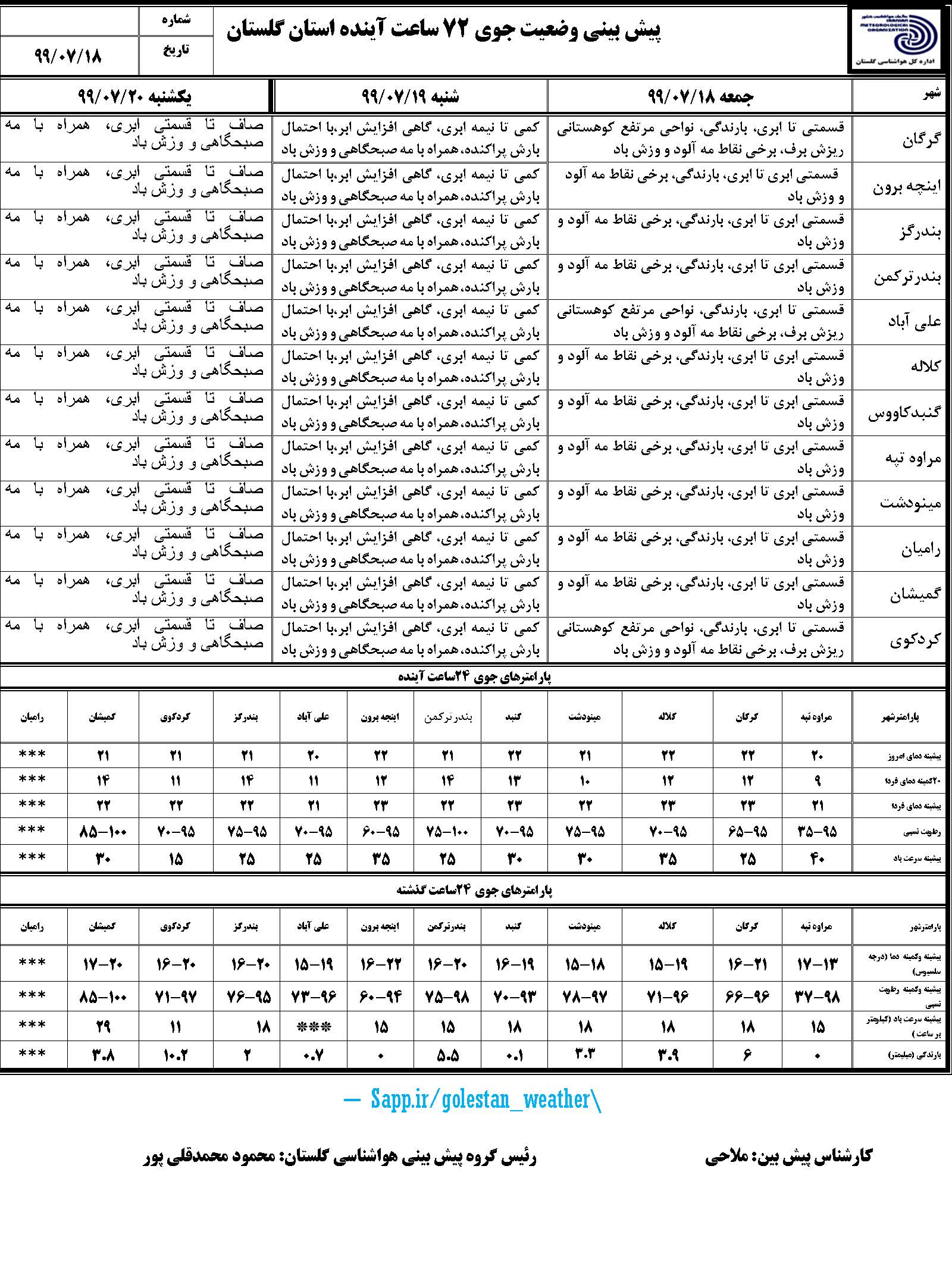 مدیرکل هواشناسی گلستان از تداوم بارش باران تا بامداد شنبه در استان خبر داد.